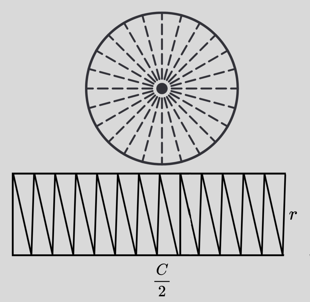 При другия подход кръгът се разделя на сектори с много малък централен ъгъл и след това си представяме, че сме ги подредили плътно един до друг, така че да образуват правоъгълник. Понеже едната страна на правоъгълника е съставена от половината сектори, то нейната дължина е половината от дължината на окръжността на кръга.
